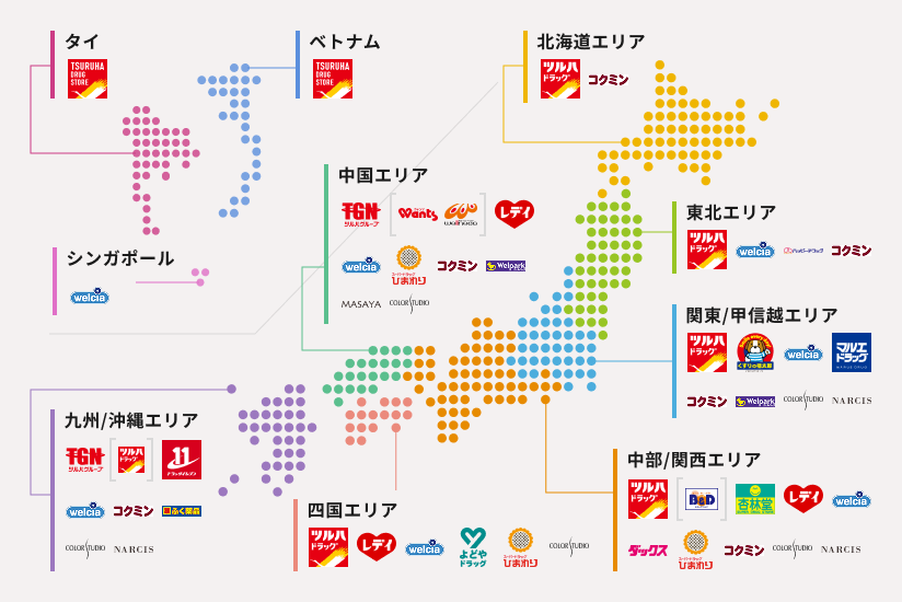 ツルハグループは、北海道を始まりとし、一つの地域の中で多数の店舗を構える「ドミナント方式」によって、地域でのブランド力を高めてきました。2000年からは日本各地で展開するドラッグストアブランドをグループに迎えて、グループの成長を実現してきました。